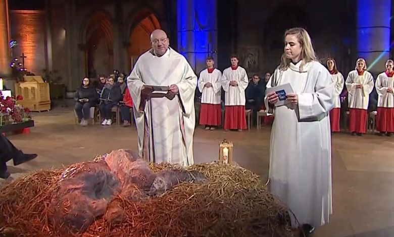 O diecezeză romano-catolică din Germania și-a exprimat regretul față de o slujbă televizată din Ajunul Crăciunului, în care a fost reprezentat nou-născutul Iisus de către o femeie adultă acoperită cu hârtie de orez lipicioasă, descrisă de unii critici drept „Iisus nămolos”.